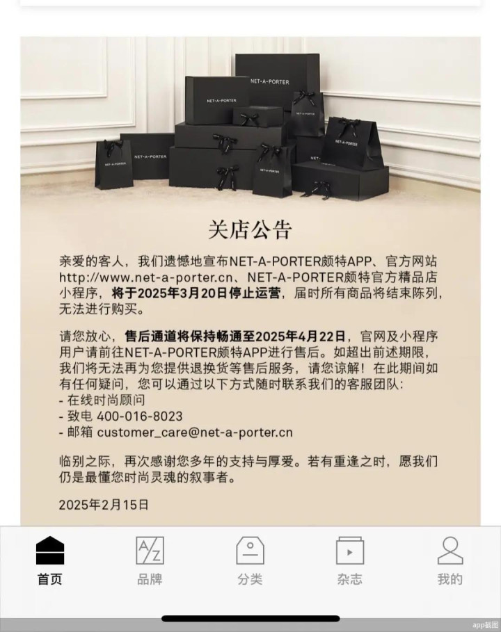 2月16日,奢侈品电商平台YooxNet-a-Porter(以下简称YNAP)宣布,将于3月20日正式关闭其在中国的所有线上平台,包括天猫店铺、微信小程序、小红书和抖音旗舰店以及公司官网和APP。该平台也确认将于4月22日终止售后服务,标志着其彻底退出中国市场。